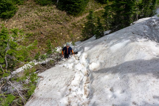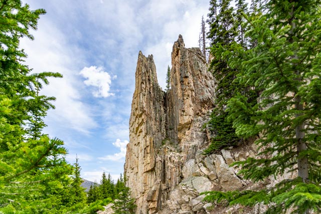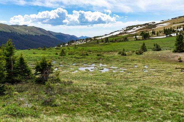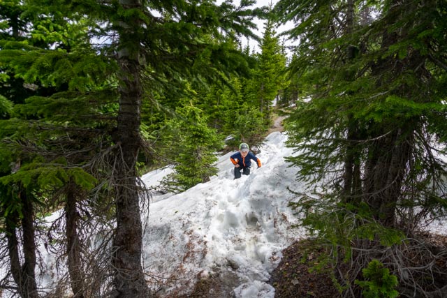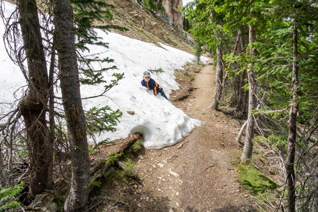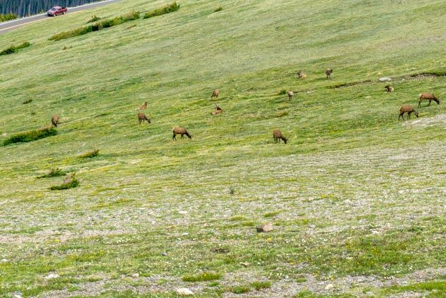 Cathy dropped us off at the Alpine Ridge Trail trailhead and headed to the Milner Pass trailhead to pick us up. Little did I know, when I took this shot of the small herd of elk trailside I also captured Cathy starting down to Milner Pass in the truck (at the top upper left corner of this photo).Jason is ready to start the run. We were running from one pass to another, about four miles of varying terrain between 10,759 feet and about 11,800 feet.We quickly discovered that our “run” was going to take a little longer than planned. There was still a good amount of snow on the trail.Other than the snow, the terrain was simply gorgeous. The wildflowers were in full bloom.There were several small alpine lakes trailside. We crossed paths with three backpackers here. The view up the canyon beyond the lake was beautiful, but the clouds were ominous.Here is one of the passes we crossed in route to Milner Pass.And another small alpine lake that we encountered trailside.This is the a small lake in the final stages of becoming a meadow.With the snow melt (it was about 40 degrees here) the paths became small streams. Of course we ended up with wet feet, you simply cannot avoid the water.The snow sometimes completely covered the trail, occasionally for good distances making it hard to follow.In avoiding one of the larger snowfields we found ourselves on an elk trail (background). When we figured out that we were heading into a canyon, we backtracked and climbed up this incline back up to rejoin the trail.Yes, we are back on the trail here, the trail is just kinda covered with snow.We looked back to see this sign directing us down the hill. This sign could easily be missed and we would have wound up miles away.I am glad we did not make it to Mt. Ida ,where we were headed prior to spotting the sign behind us (in the previous photo).The Milner Pass Trail was in pretty good shape once we started descending to the trailhead.Jason had one last chance to stumble in the snow!We came across several of these formations as we rounded a corner descending to the trailhead.Once we reached lake level, we had to go around the western end to find where Cathy parked the truck.Mission complete!