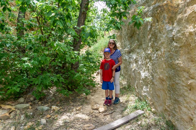 On July 4th, we drove into Golden to further investigate the town. We had visited it briefly the day before but had very little time. We tried to find the Triceratops Trail but had to do a loop on the Interstate as the GPS sent us in the wrong direction, then we could not find the trailhead so we parked on the Colorado School of Mines Campus and walked across the Fossil Trace Golf Club (kinda like a game of frogger) and wound up at the end of the trail. We met a family from Minnesota who were surprised to see us walk up from the course. These are many ferns that have been preserved for roughly 68 million years.This is the footprint of a TriceratopsThese are the footprints of a hadrosaur, a duck-billed herbivore.When we reached the top of the trail again, I read that there was a Tyrannosaurus (T-Rex) footprint on display and I realized I had missed it. I walked the 100 or so steps back down into the depths of the canyon and searched. I found the track, encased in a plastic viewing box. Apparently it had became unattached to the wall and this is how it is being preserved.Pre-historic raindrops prints have been preserved for millions of years. It must have really rained hard!Cathy and Jason were down in the canyon, between the sandstone walls.