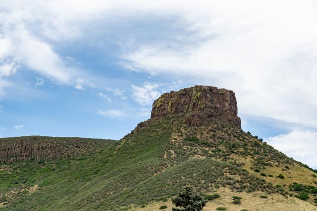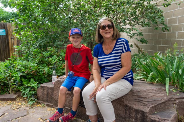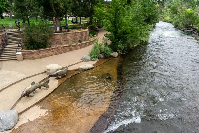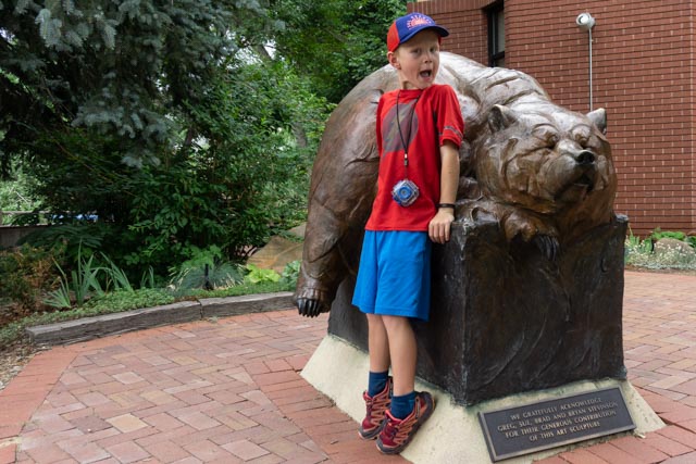 This is one of the many points of rock that dot the landscape near Golden. This was taken from our downtown parking space.The town of Golden had shut down their downtown area. We thought it was for the 4th of July but found out that the restaurants could only serve outside. Washington street was lined with dining tables but the bars were inside and full of people. We saved money by leaving our masks in the car, thus ensuring that we could not enter any of the many antique and gift shops.Cathy and Jason relaxed in one of the downtown gardens maintained by the local garden club.Continuing down the street, we found this bridge which spanned Clear Creek and led us to the adjacent Parfet Park. Notice the large, bronze trout sculptures lining the walkway. The Golden Visitor Center was located across the street. The creek is loaded with trout and used by tubers during the summer. We were early so the tubing had not really started for the day. There was a take-out area just beyond the park.Jason did not seem to be afraid of this bear. But he did get to ring the bell!Jason missed his calling. He could have been a paperboy!NO visit to Golden is complete without meeting Mr Coors himself!And finally, what drew our attention to downtown, the fully extended ladder truck with the enormous American flag. The ladder was extended to almost 100 feet.