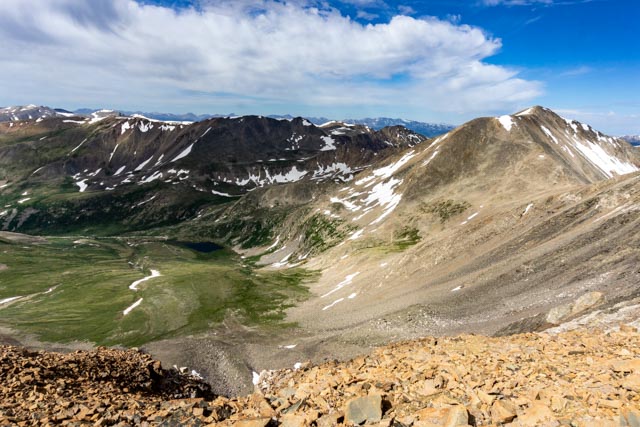 Here is 14,148′ Mt. Democrat (to the right), 12,040′ Kite Lake (center left) and the Mt. Democrat trail. You can make out the switchbacks in the Class Two trail leading to the top of this mountain.