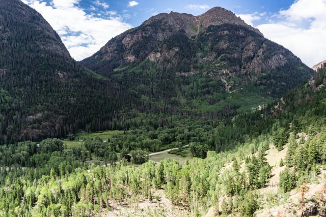 The road winding up the valley is the continuation of Cinnamon Pass road leading to Ouray. This road is for short wheelbase 4 wheel-drive and is run mostly by motorcycles and 4 wheel Polaris OHV type machines. I don’t think I would attempt going beyond the trailhead in my pickup!