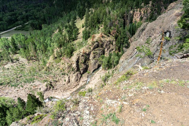 Looking almost straight down you can see the river flowing through the very narrow canyon and the evidence of an avalanche that came down the chute beside me. We would pass dozens of these avalanche areas, viewing hundreds of trees blown down and trees snapped about 10 feet up from the base.