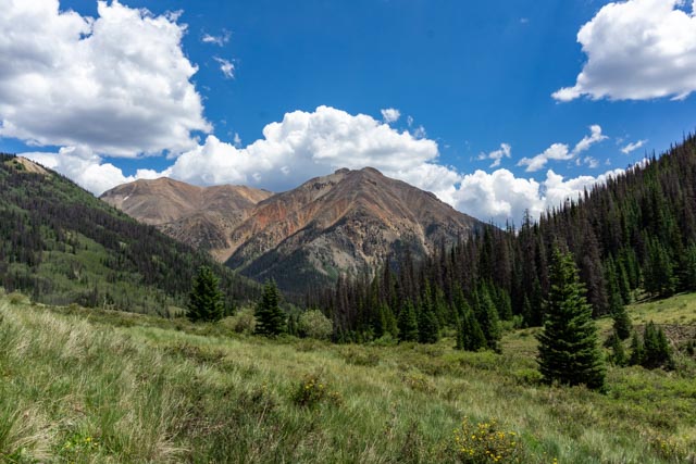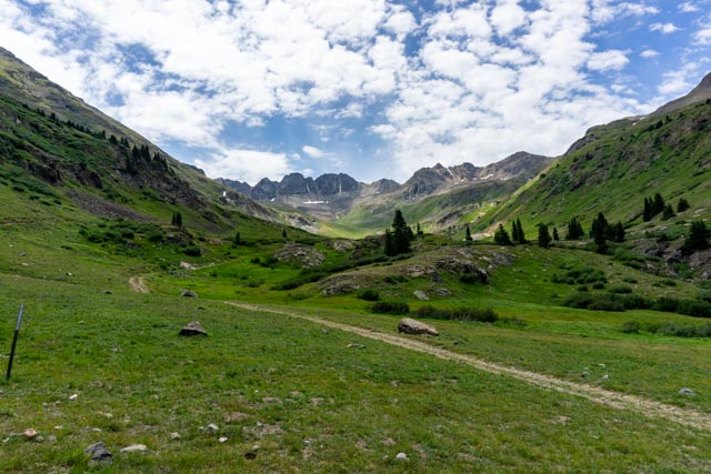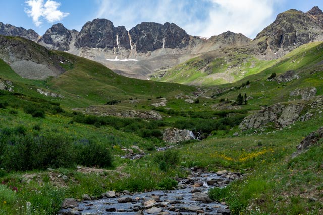 This is the view from the trailhead at American Basin. It was a 1.5 hour, 20 mile drive on a 4 wheel-drive road, across two streams and a couple of rock fields. I departed Lake City at 5:00AM and was on the trail at about 7:00.