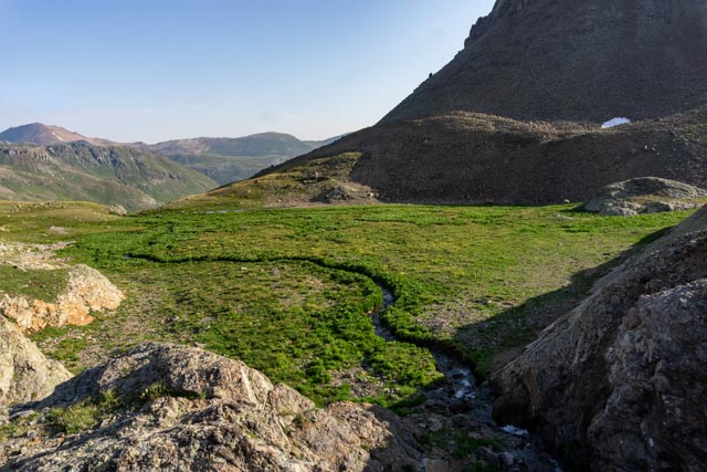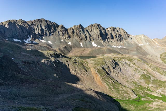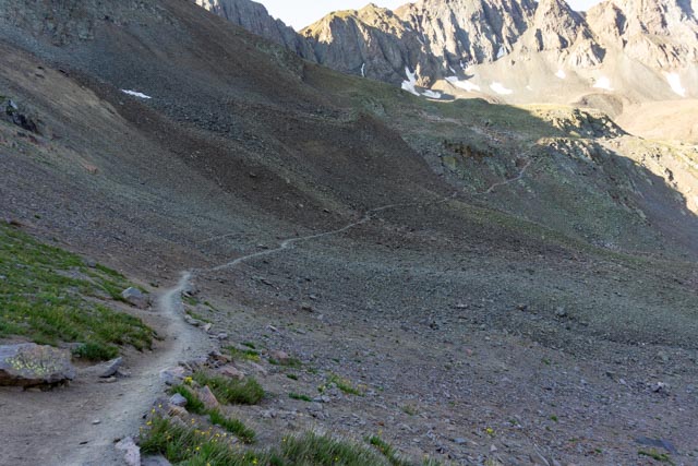 The sun was just starting to hit the tallest peaks of the ridge, (left to right) 13,588, 13,652, 12,924, 13,423 and 13,441 feet. My destination was Handies Peak to the left, off of the photo at 14,048 feet.