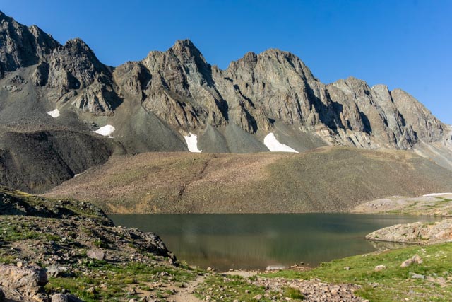 After hiking several switchbacks I reached the saddle connecting Handies with the crags above Sloan Lake.