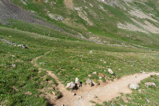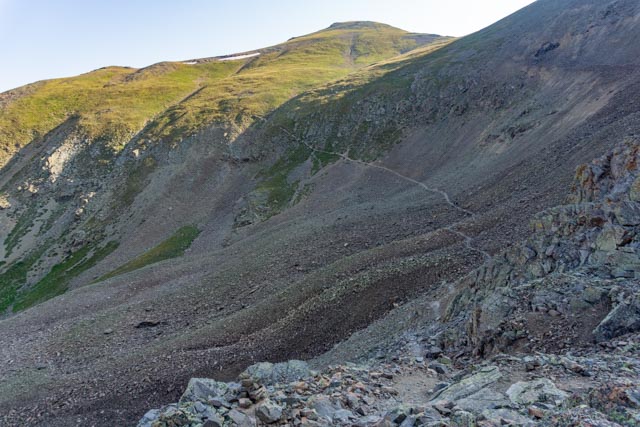 On the return down the mountain, I stopped to talk with several climbers who were going to take the unsigned Grouse Gulch trail to the right which would take them in the wrong direction, away from Sloan Lake and Handies. It ran downhill for a while so it was tempting. They were a little disappointed when I showed them the trail, which went up through a rockfield. There was a group of four men here turning back once they realized this was less than halfway up!