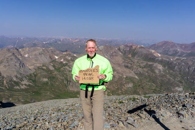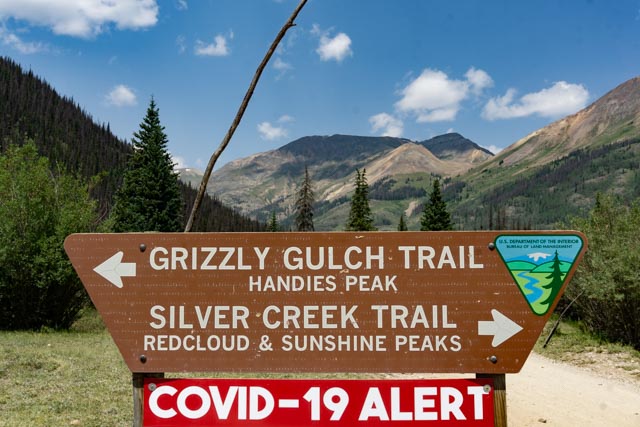 I took my obligatory photo with a remnant of someone’s cardboard sign. Redcloud, Sunshine, Wetterhorn and Uncompahre Peaks are to my left, out of the photo view. They are all 14ers, I will have to return! Redcloud and Sunshine are doable, we could not make it up the trail to the Uncompahre trailhead in our truck and Wetterhorn is rated a little too difficult, at least for me.