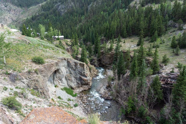 In the morning we decided to take a run up one of the nearby canyons, Cinnamon Pass, which connects with Engineer Pass to form the scenic “Alpine Loop”, an OHV trail which is about 120 miles in length and connects Lake City with Ouray and Silverton. We stopped at this wide spot on the trail to view the townsite of Sherman in the valley below. I nearly stepped on a rattlesnake when exiting the truck but the view of the valley was beautiful, although the town was no longer there. Sherman was platted in 1877 and featured streets sixty feet wide! Located at the confluence of the Gunnison River and Cottonwood Creek, it repeatedly flooded. A runoff control dam built upstream ruptured during a cloudburst and inundated the town, which did not survive the damage. You can still spot the three-tiered rock wall foundation of the Black Wonder Mill, which operated as late as 1897.