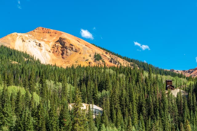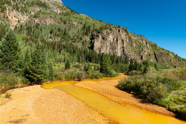 We stopped at this small reservoir just below Red Mountain Pass at 11,000 feet. We stopped here because the sun was just beginning to hit the water and we were intrigued by the yellow stream that was flowing on the other side of the highway. We had spotted the yellow creek a week earlier while heading to Lake City and vowed to return when we could park our truck and take a closer look.This yellow creek, Red Mountain Creek, is actually colored by mine tailings further up the canyon. I would hate to have to take a drink!We stopped to look at the headframe and other leftovers from the Yankee Girl Mine. Unlike other local mines, the shaft of this mine went straight down, to a depth of 1,200 feet. Ore from this mine assayed at up to $10,000 per ton making it one of the richest concentrations of silver ore in the United States. The mine closed in 1898 after sixteen years of operation due to a decrease in the value of silver. During its run, it produced over $100,000,000 of silver in today’s market value.