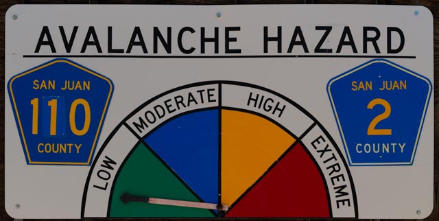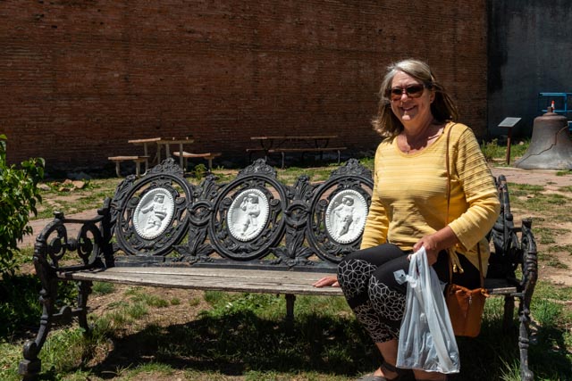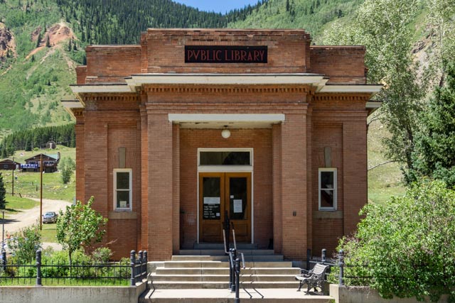 You don’t see a lot of these signs in Georgia. At least the hazard was “Low”, except for the rock slides!This is the County Courthouse.This is the Silverton City Hall building, built in 1908.We passed the Silverton library on the way up the mountain to the Miners’ Memorial.This is the Miners’ Memorial, also known as Christ of the Mines Shrine. We spotted it, high on the hillside from downtown and decided to drive to it. Of course I did not ask how to get there so we took about every road in town before finally determining that it can be reached from the main road about a half mile out of town.Cathy rested in the downtown city park on a vintage bench with pressed figures on the backrest. Yes, we did visit some of the local stores.Michigan rocks in Colorado? What the heck, we had to check it out, for Michelle’s sake.We enjoyed a lunch in the Lone Spur Cafe in Silverton. Evidently Wyatt Earp, Billy the Kid and Bat Masterson hung out here at one time. There is a bullet hole in the bar from Bat Masterson, evidently he was not as sharp as a shot as we were told.It seems like the wildlife is always watching us. This guy was directly over the table.