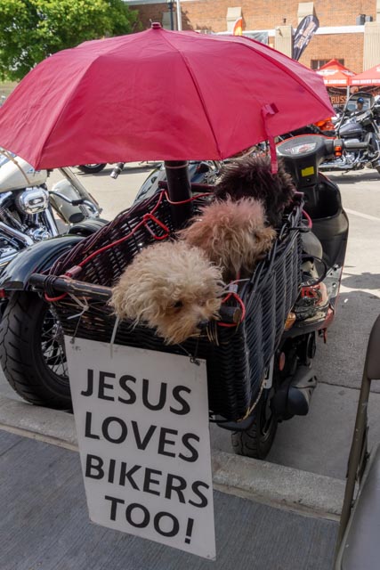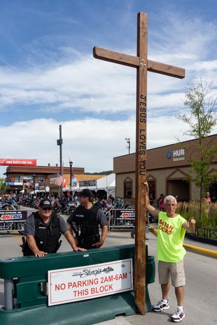 This is the Sturgis police chaplin. He alternates between a uniform and this shirt. Today we caught him with his 90 pound cross, which he carries up and down the street. He told me that he has been doing this for more than twenty years!