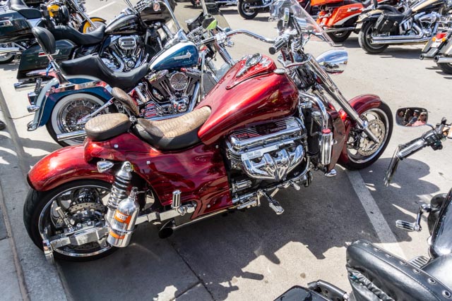 Harleys, Indians, Hondas, BMWs, just about every configuration imaginable were here. There were several trikes with massive V-8 engines and, yes we did see some (regrettably) topless ladies in the crowd.