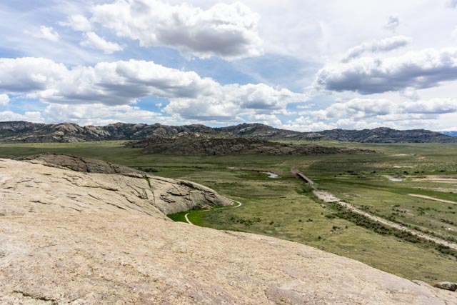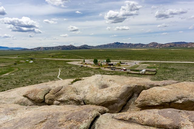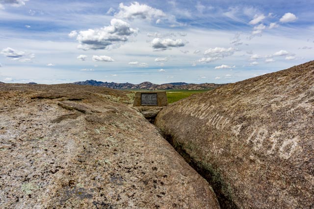 Heading south on I-87, we took the cutoff to Edgerton, SR387 to SR259 so we could experience the site of the Teapot Dome Scandal, which exposed back room dealings between wealthy financiers and high ranking government and military officials in the 1920s. During the scandal, President Harding died, and Secretary of the Interior Albert Fall, Secretary of the Navy Edwin Denby, and Attorney General Harry Daugherty all resigned. The problem was . . . the entire oilfield was leased to Mammoth Oil without competitive bidding and Albert Fall was caught redhanded taking bribes. In 1931 Fall was convicted, fined and imprisoned for committing a felony while in office, becoming the first Cabinet officer to be jailed. Harry Sinclair was subsequently acquitted of bribery but sentenced to jail for contempt of court and the Senate. Hmmm, government!We saw this group of range horses grazing in the oilfields. After visiting the site of the Teapot Dome Scandal, we continued on to Independence Rock, named the “The Great Record of the Desert” by Jesuit Missionary Jean Pierre DeSmet in 1841.Thousands who traveled the Oregon Trail to the West stopped by this landmark and chisled their names into the rock.The extreme weather is working to slowly erase the names of the early pioneers and they are becoming hard to see.Independence Rock is a significant feature in the valley and I had to scramble up the curved face to see the view it provided. I made sure that climbing was allowed (it was, but there was the typical warnings of dangerous slips and falls) and up I went, using this crack as a handhold. That is Cathy waiting at the bottom. I am about 30% up the rock at this time.Once I reached the top, I found several other markings made by the early pioneers (along with more recent carvings by vandals).The museum and rest facility is shown here and you can barely make out our rig parked in the upper right of the lot.This is the original roadway and bridge over a waterway feeding the Pathfinder Reservoir.We saw this memorial to the original Oregon Trail so we backtracked to find the actual trail (below with the stake in the middle). You can see the lack of bushes straight back from the stake. The trail traveled through a “notch” in the closest range of hills below. You can barely make out the notch just to the right of a straight line extending from the stake.Next we entered the Flaming Gorge National Recreation Area. This was a very large section of land with very little habitation. There is a huge reservoir in the canyon which extends from Green River almost to Dutch John, over 30 miles.In the distant foothills is the site of the First Rendezvous in the Rocky Mountains of (white) traders and trappers held in July 1825 near McKinnon (another side trip). Among those assembled for the 1825 event were some of they industry’s most colorful characters: General Ashley ( who owned the trading post and organized the Rendezvous), Jedediah Smith, Bill Sublette, Davey Jackson, Tom Fitzpatrick, Etienne Provost and Jim Bridger. Ashley travelled to St. Louis with over $50,000 in furs when the trading ended. This Rendezvous became a yearly tradition until 1840. (Readers of Western history will recognize these names.)