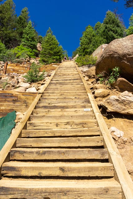 The Manitou Incline, a steep stairway leads about a mile up the mountain. This stairway was closed last year for renovations and I have never been around when it had been open. It just opened and there were no more excuses. I made the climb (and later found out you are really supposed to reserve a time slot). There was a lot of green fabric laid down to prevent erosion on the steep sections and about every 30 steps there were buttresses of large timbers on the left side to provide a flat spot to rest as it was too steep to try to rest on the right side of the staircase. The individual steps are held in place with cables. It was pretty neat how the entire staircase was engineered. There was some abandoned mining equipment scattered in the brush on the way up but believe me, I made NO attempt to investigate.