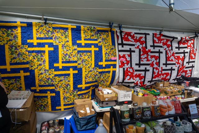 You don’t see these signal wigwams any more. This was attached to the Bellis Canadian National Railway Station. We saw this period depression glass in the United Merchants of Alberta general store. These irons were also merchandise from the 1930s. This store was fully stocked with period merchandise.I would have loved to see the price of fuel when these pumps were operational!Cathy is in front of St. Vladimir’s Ukrainian Greek Orthodox Church. There are three active churches in the village.Behind the church was this “very important” outbuilding. Its discovery was timely!From the back of the church, we spotted this building with the Union Jack flying, so we walked over to it. It is the Russia School. We were given two presentations inside, the right side was grades 1-4 and the left side was for grades 5-10. Both presentations were given by persons in character who answered only period questions. We also visited the basements of the school, one for girls and one for boys, when the students went for recreation during the winter months. We received details on the history of the Union Jack Flag from the instructor.This view is looking at the the St. Vladimir’s Church with the Alberta Lumber Company buildings in the right foreground. The barn belonged to the postmaster.We walked up the hill to St. Nicholas Ukrainian Greek Catholic Church. I walked around the church, looking in the windows and it is indeed active. It would have been nice to have to time to attend one of the services here.Here is a view of downtown from the St. Nicholas Church. The large barn in the foreground is the Radway Livery Barn and the larger barn behind it is the Pawlenchuk Barn.This small police post is attached to a home where the officer resided with his family. This is the Andrew Alberta Provincial Police Post, manned by a single officer. The cell was pretty stour, with steel walls and a steel floor and ceiling. It was used to temporarily house prisoners. Being attached to the home could potentially make for some LOUD noises for the officer’s family!In the morning we attended the Ukrainian Festival in Edmonton. Edmonton is home to a large contingent of Ukrainian folks. These two quilts, in Ukrainian patterns, were for sale.There were a myriad of booths, offering everything you could think of with a Ukrainian color, symbol, or flag. There was a large food and drink area behind the booths with two stages for performers. In retrospect we should have brought chairs and planned on spending more time in the music and dance venue. We enjoyed a traditional Ukrainian lunch.We did get to enjoy some native Ukrainian performers on a very small stage in the crafts venue.
