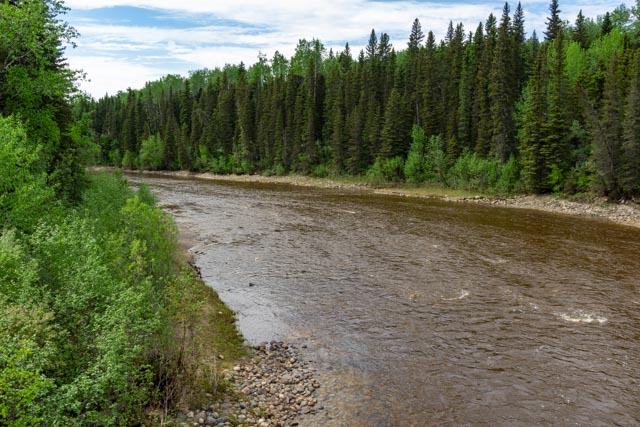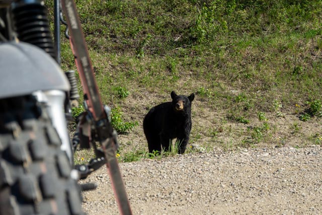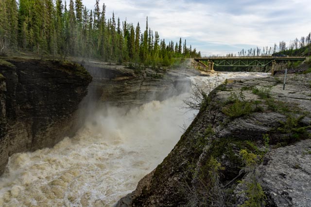 Leaving Yellowknife, we traveled the Waterfalls Route to Sambaa Deg Falls Territorial Park. There were just two campers at this site. This is the upper falls, a short hike upriver. Cathy was attacked by mosquitos so she went back to the motorhome before heading downstream to the the main attraction. This is Saamba Deh Falls. The photo does not do it justice. It was the most powerful waterfall I have ever seen. Scary powerful! I threw a log in the water just above the falls and it totally disappeared after going over the falls. There were several memorials on the opposite cliffs to those who had fallen in here.We made a side trip to Fort Simpson and I rode my motorcycle back towards Sambaa Deg, about 100 miles of dirt highway. Fort Simpson is located at the junction of the Liard River and the Mackenzie, thus we took the ferry across the Liard to reach the settlement. We had a Chinese lunch in this First Nations community (and it was pretty good)!This is one of the many emergency shelters positioned along the highway between Fort Providence and Fort Simpson. I must really get COLD here. About halfway back to Sambaa Deg it started to rain so we had to scramble to get the motorcycle back on the truck in the rain.The next morning we were headed for Nahanni Butte, all dirt and gravel roads. We stopped to watch this bear and I got out of the vehicle to get a couple of photos. He approached the truck and when he got to the truck I quickly walked back to the motorhome. He actually got up on the back of the truck to see what was there. At Checkpoint we made the turn towards Fort Liard and our next camp.Yes, there were bears everywhere. All we saw were black bears, the grizzly stay pretty much in the bush.Crossing the Poplar River in Yukon Territory is a colorful view.This is crossing the Blackstone River in Yukon Territory.This is Nahanni Butte, a prominent point in the landscape. The summit was cloud covered the entire time so we never got to really see the top. All of the land across the Liard River here is part of the Nahanni Territorial Park and holds a Dene settlement. The park is only reachable by a very long (79km) hike from Tungsten, off the Campbell Highway or by boat across the Liard. All access is controlled by First Nations. It is open to flight-seeing tours, and floatplanes (with appropriate permits). This is a World Heritage Site, due to its diverse landforms, waterways, wildlife, forests and First Nations history. There is a 315 foot waterfall in this park.After leaving Fort Liard, we were slowed somewhat by this herd of bison. We just waited until they decided to cross the road.Back on pavement and heading toward Liard Hot Springs I noticed a large porcupine just sitting along the roadside. I got out and followed the guy trying to get a photo but he kept walking, entered the woods and climbed this tree. You can just see him give me the thousand mile stare.It was starting to clear up a little so I took this photo of a braided river. We are in Northern British Columbia here.At another stop along the highway I noticed that we were parked between two snow-melt waterfalls. If we hadn’t stopped, I we would have never noticed these waterfalls, as they were located high up the cliffs.We stopped at a wide spot in the road the watch this river. The scenery is amazing.Here is another photo of the scenery along the highway.And another shot of the view.Wow, the Liard River Hot Springs has become electrified. Evidently there have been numerous intrusions, the whole park is surrounded by electric fencing, clearcuts in front of the fencing and electric cattle guards to keep animals from entering through gateways.This storage area for hikers and tent campers has been added.