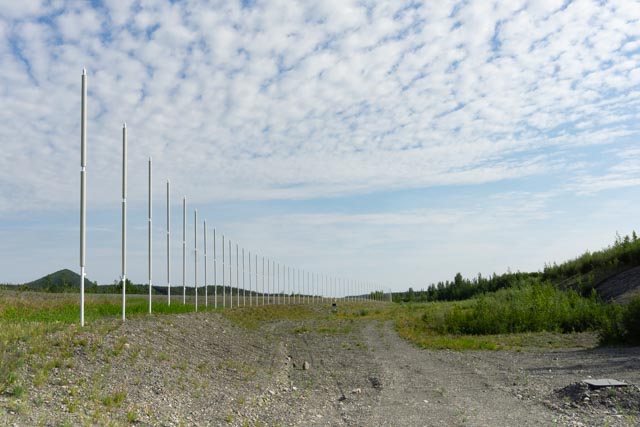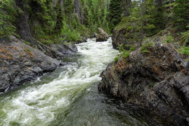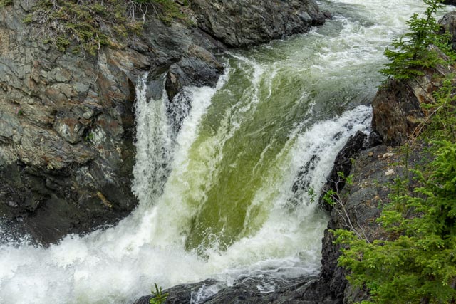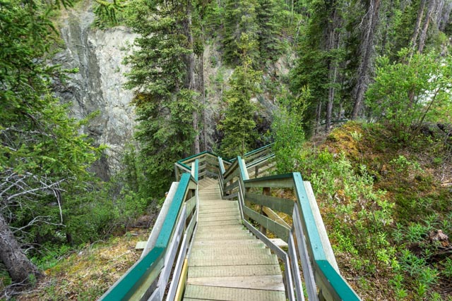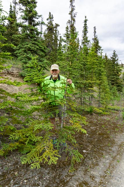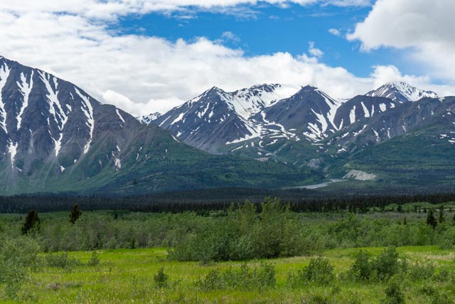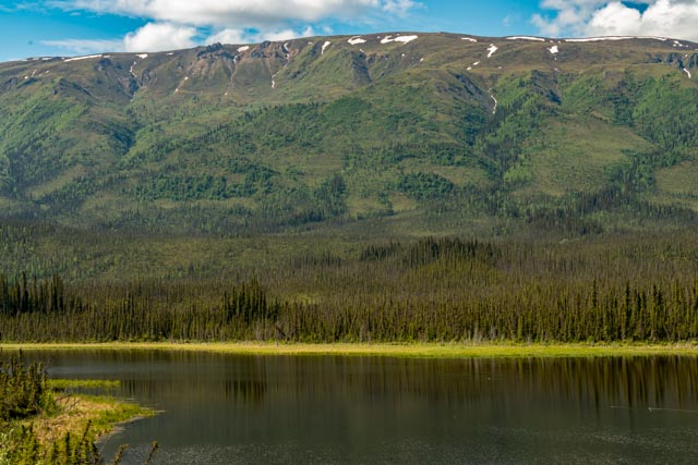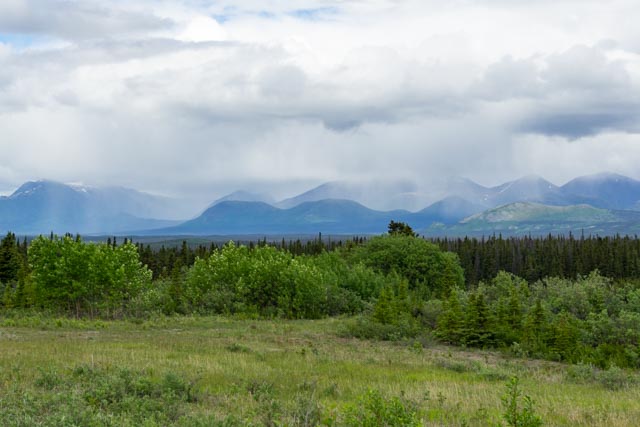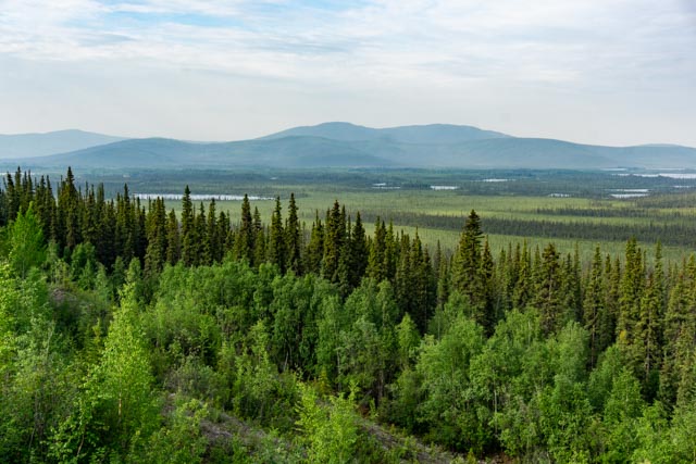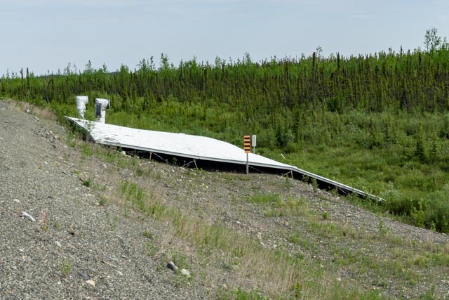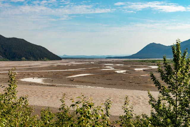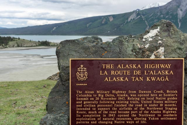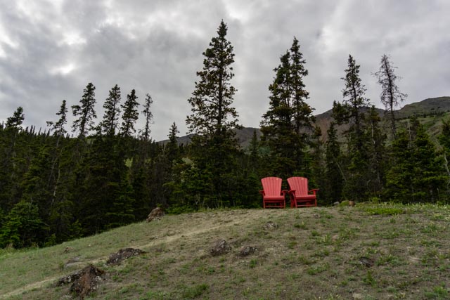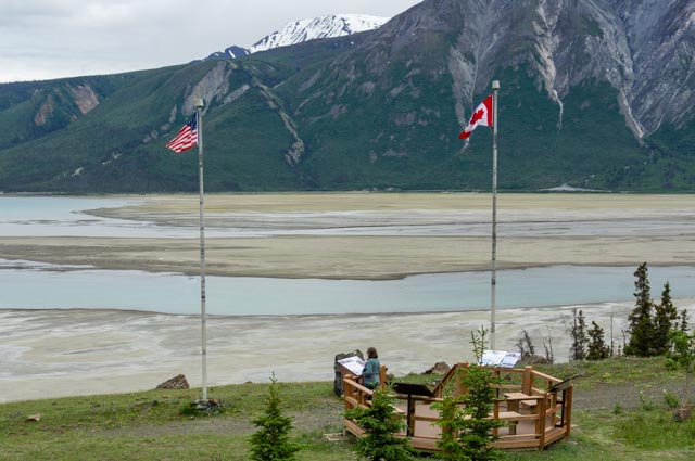 While at Haines, I talked with a couple who made the walk into Million Dollar Falls. They had a 14 foot motorhome and told me that the road was very narrow, their motorhome would not make it so they walked in from the highway, but the view was well worth the walk. We had heard the same thing so we skipped it on the way in, but decided to make the walk on the way out of Haines. I saw the entrance and it did look too bad, so we decided to try and drive in. The road was far better than what we have been experiencing and we drove through the park, past the walkers who left their cars on the highway. The stairs down to the viewing area of the falls were the hardest part of this side trip!This is Million Dollar Falls.The water flowed down the canyon and into the falls.I tried to capture the alluvial field running out of the canyon between the mountains. It was about five miles away and resembled a river.I took one more photo of the Kluane National Park. It was raining in the distance, across Kluane Lake.This is a photo of the original Alaska Highway, cutting diagonally up the mountain, taken from the Slims River Bridge. The Thachal Dhal Visitor Center is to the left of the photo. It was closed by the time we reached this area. This is the base of Thachal Dhal. It was formally called Sheep Mountain, but many sites are returning to their traditional First Nations names.It is a lovely view of Kluane Lake from the monument at Soldier’s Summit.Hiking up to Soldier’s Summit, I was playing with the miniature trees.Cathy read the history of the Alaska Highway while I was up the hill, sitting in……these. Provided by Parks Canada, most viewpoints are furnished with similar chairs.This is the view of the nearby mountains that provided the watershed for Kluane Lake.Yes, we are in bear country. If you camp in a soft-side enclosure (tent); you are supposed to stay inside this electric fencing.The campsites provided a platform on which to pitch your tent and lockers for food storage. It is almost like being in a prison environment, but relatively safe from bears. We spent two nights in this campground but we were by ourselves in the motorhome.We spent two nights at Discovery Yukon. This is the junction of the White River (foreground) and the Donjon River. The White River was named by Robert Campbell (of the Hudson’s Bay Company) for its coloring, caused by volcanic ash.These ponds were everywhere. Cathy spotted a grizzly bear and a moose while camped near here.We saw a couple of orange neck egrets on a nearby pond. She is sitting on a very large nest.There is a section of highway that is “off limits” to the Yukon Highway Maintenance crews. This section if being monitored by scientists for the effects of the permafrost and the movement of earth (and highway). The road over this section was very rough, with highway “snakes” (cracks in the highway that could be up or down as much as a foot). We were warned by a Yukon Highway worker to be on the watch for these in this area.I had to take another photo of the landscape as we approached the border. These miniature trees are really captivating, at least to me.We saw many lakes and ponds dotting the landscape. After crossing into Alaska, we made a stop at the Tetlin National Wildlife Refuge Visitor Center. I was seeking information on Northway, an Athabascan settlement. We decided not to attempt the side trip after talking with an Athabaskan docent at the center. She told us that she moved from Northway due to the military dumping hazardous materials and the prevalence of cancer in the community.The view looking from the deck of the Refuge Center was breathtaking.