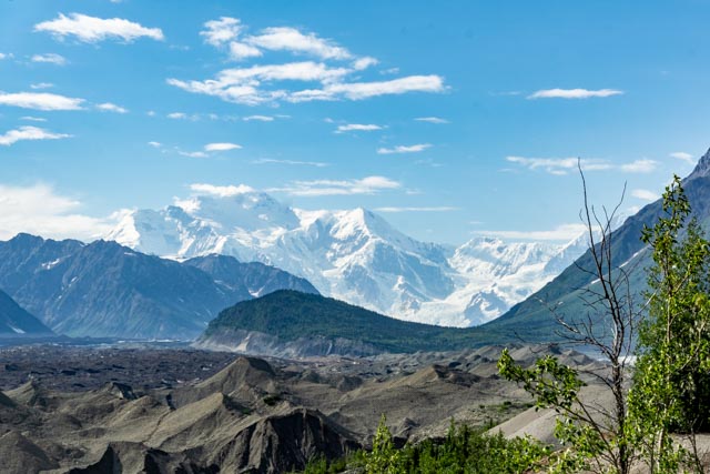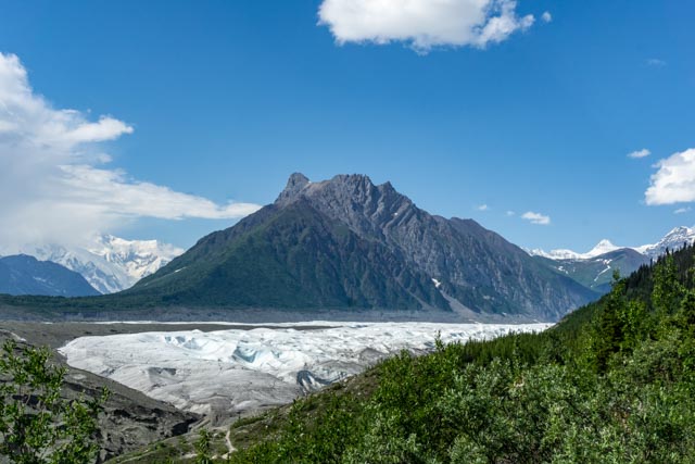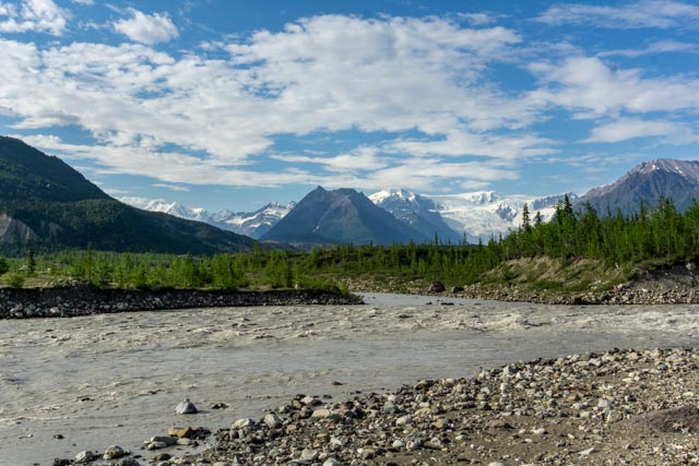 You can see Rime, Atna and Parka peaks form the starting point of the Kennicott Glacier. The mounds in the foreground are actually ice, covered by decades of gravel and dirt. This ice is over a hundred feet thick and continues to melt slowly, forming the Kennicott River, which flows into the Chitina River.