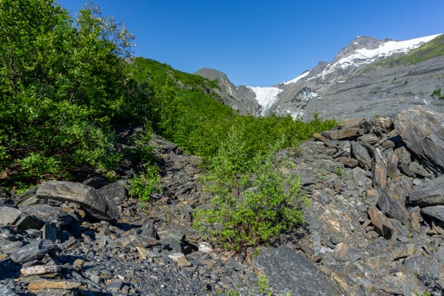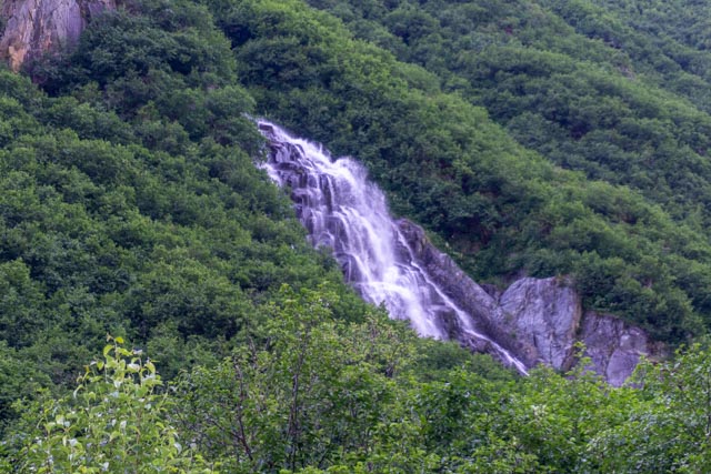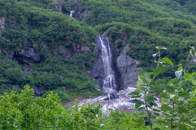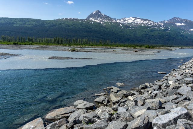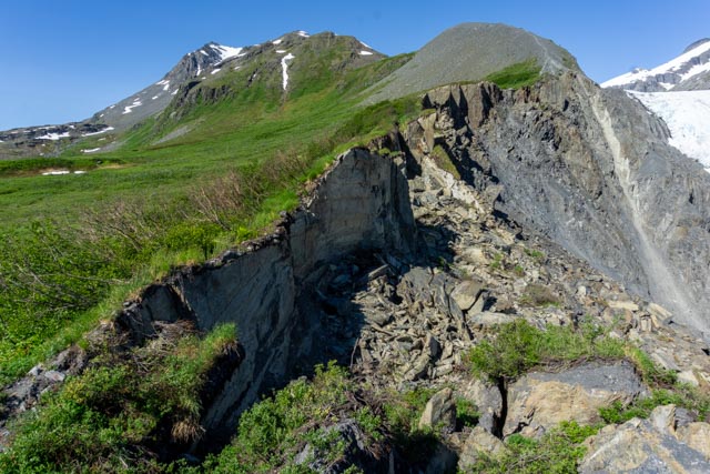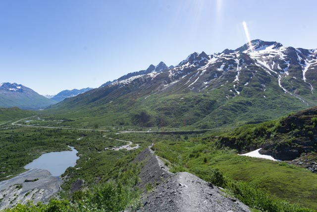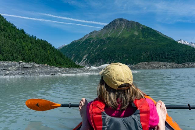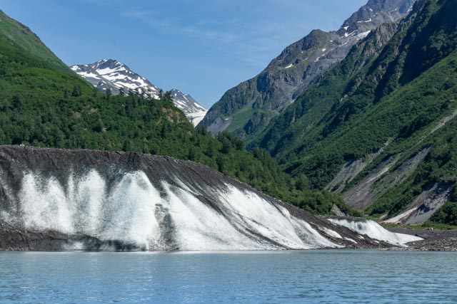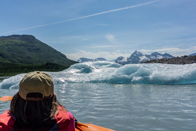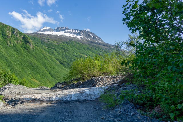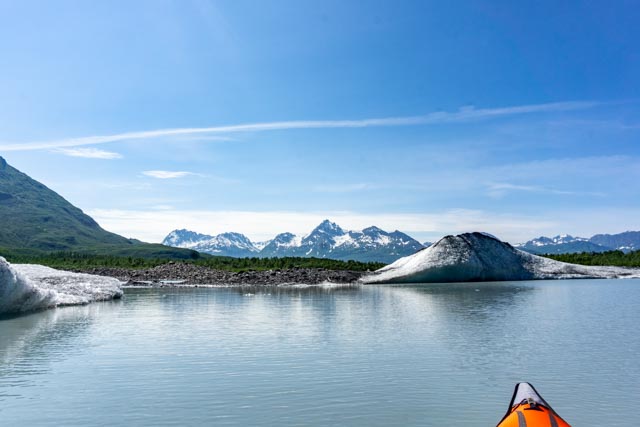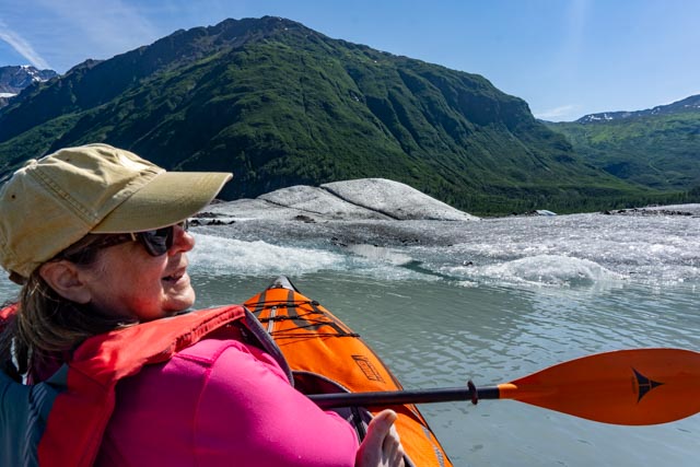 One our way to Valdez from Kenny Lake, we stopped for a moment to view the Worthington Glacier. I spotted what looked like a trail up the left side of the glacier.After setting up camp in Valdez, we headed out to Dayville Road to see if the salmon were running. This waterfall is across the road from the Soloman Gulch Fish Hatchery.We headed out Mineral Gulch in the truck but we turned around after the road got very muddy and narrow. We were told that a landslide had covered the road about eight miles in but we only made it about two miles before turning around. I would return with my motorcycle in the morning. I passed this snowbank on the way in on the motorcycle, crossing a washout at Horsetail Creek stream that was a couple of feet deep. I wound up with boots full of water.The further in I got, the more gorgeous the views became. But the roads kept getting narrower and muddier. And there was snow starting to build in shady places on the road, now trail.I hit the final snowbank about seven miles in. I hadn’t seen anyone else in here for the last five miles. Since the snow covered the road and led to a cliff straight down to the river, I chose to turn around at this point.I crossed this small snowbank, getting stuck the first go-around because I was going too slow. I sped it up and used by legs as outriggers and made it across, (just a little sideways).The views coming out were unbelievable, the mountains here are actually behind Valdez. The road follows Mineral Creek.Because of the recent rains and heavy snowfall, waterfalls in the canyon were plentiful.This is a panorama taken from the small boat harbor in downtown Valdez. It is like being in a little Switzerland.In the morning we returned to the Worthington Glacier and I was going to go up the “trail” that I spotted previously.After bypassing a couple of warning signs and closure signs, I found myself alone on the “trail”. The route was very steep, with shear fall-offs on both sides. You don’t want to stumble here.As I neared the top of the glacier, the views of the landscape were remarkable.This is my endpoint of the trail. What I had spotted from the highway turned out to be a rockfall, across a steep, shear canyon that was at least 100 feet deep. I am not a rock climber so I chose to take the gimme and turn around. There were bear warnings near the base and the view from the trail was perfect bear country. I kept scanning the hillside but did not spot one. Perhaps it was too late in the day.The cliffs and rockslide that ended my quest for the top are pictured above. The edge on the left was extremely thin and unstable.This is the view from the (almost) top looking down at the parking lot. It was beginning to fill up. Cathy is down there somewhere. I did not know there was a lake here until I looked back down the trail.Heading down, I was careful not to slip frontwards, backwards, or to either side. On the way back to camp we spotted the neat mixing of colors on the river while exiting Keystone Canyon. The grey water is glacier melt on the Lowe River, and the clear water is a stream coming down a granite canyon.Across the road from where we stopped we spotted this beaver pond.In the morning Cathy and I took the kayak out to Valdez Lake. Two years ago, only weeks after Jason and I kayaked on the lake, the Valdez Glacier, over twenty miles long, had a massive calving, spewing city block sized chunks of ice downstream, killing several kayakers that were in the lake. After reviewing the new safety videos provided by the state and local authorities, we decided to get up close and personal with the ice on this visit.The main body of the lake was like a tangled mess of icebergs. What looked to be clear passageways might only be inches deep. It would be easy to get lost in the maze. We could see both the Valdez Glacier and the Camicia Glacier from the lake.We spent the better part of the day exploring the icebergs and you don’t get too many chances to do this.Ice, and more Ice.The scenery was incredible, with the mountains in the background. . Everywhere we went there was ice. We either followed others to clear passageways or others followed us to clear passageways.Cathy is looking up the canyon where the Valdez Glacier is, now about a mile upstream.Some of the ice chucks were massive, this one is about 50 feet tall and covered with years of sediment, rocks and dust.Cathy is looking out past the ice into the mountain range behind Valdez, in the Chugach National Forest.It looks like Cathy is holding the ice form but she is actually taking a picture with her phone. I am taking a picture of her taking a picture. I did achieve my goal of swimming with the ice. While exiting the kayak to get on a landform, my lifejacket caught on the kayak and in I went. All the way in. My automatic lifejacket works, it activated and floated me to my feet, then the other side popped (activated and sent me back in). I wasn’t too cold once I climbed on shore. Lie! It was COLD. Now we have to find another life vest for the rest of the week as I will not be able to get the vest charged until Anchorage.