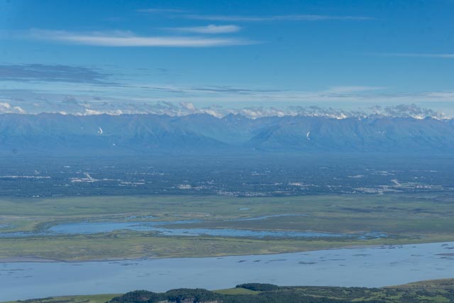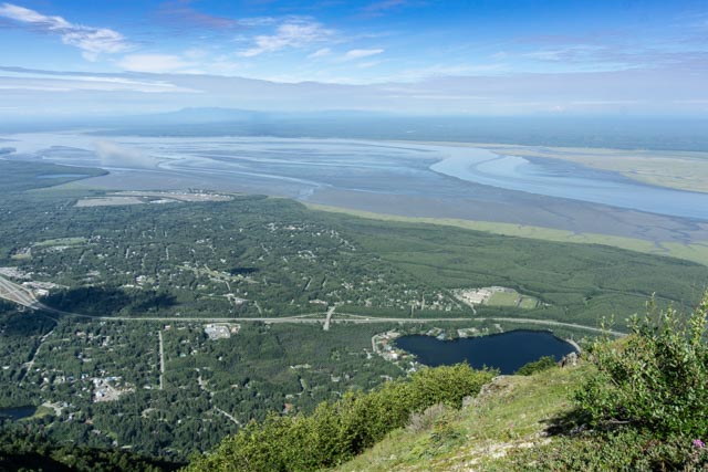 This is the view, overlooking the Mat-Su Valley, including the towns of Palmer and Wasilla. The mountains in the background are in the Denali Range. The green area is the Palmer Flats and is a prime bird and moose watching area. There are some marked trails and picnic areas, all within hiking distance to the parking area. I would assume you have to be tidal aware as the fluctuations in tide can exceed 34 feet here.