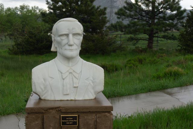 We finally made it to Estes Park in Colorado albeit a day early and parked in our space for the night. It was raining in the morning so we decided to “walk the town” which is something we usually don’t do. We did stop at the Estes Park Museum and saw this bust of the town founder, Joel Estes, 1806-1877. I dashed outside in a drenching downpour to get this photo and quickly returned to the covered entry.