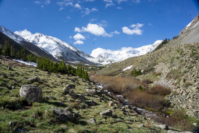 In the morning, Mike and I drove to the Missouri Gulch Trailhead to climb Mt. Belford at 14,197 feet. We took the Missouri Gulch Trail, quickly crossing into the Collegiate Peaks Wilderness. We crossed the creek on this hiker built “bridge” about halfway up to where to trail forks. The right fork continues on to Missouri Mountain (14,067 feet) and the left fork headed for Mt. Belford (14,197 feet) and on to Mount Oxford at (14,155 feet).