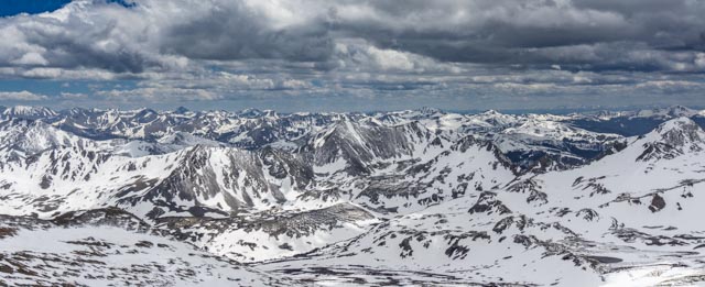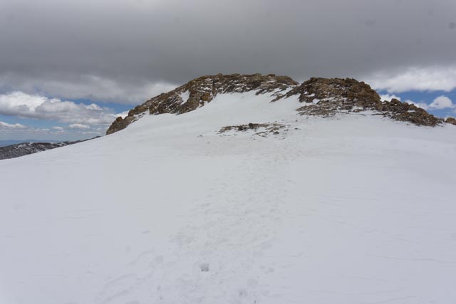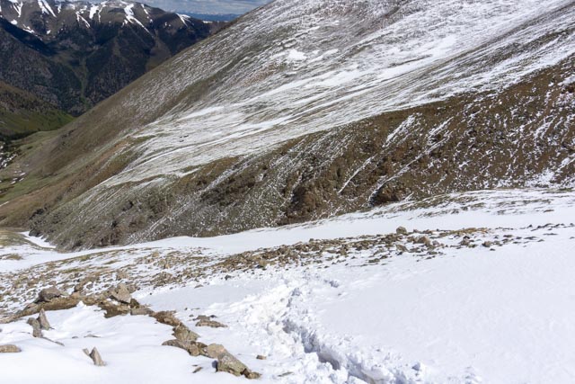 I took one last look at the false summit of Mt. Belford. The mountaineer way down is to ascend and descend via the gulch between the mountains. It cannot be done without winter equipment. We went up the spine, then circled to the right around to the summit just peaking over the mountain on the left.