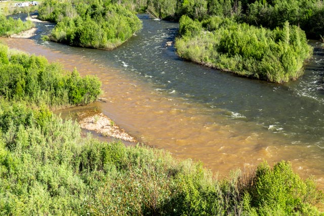 After reaching the highway, we backtracked over McClure Pass to Kebler Pass, which was just cleared this morning. We were told it was a paved road . . . WRONG. We did spot this interesting mix of colors between the two joining rivers.