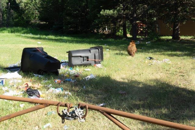 I spotted this bear working the garbage containers. Both containers were tied shut but not tied well enough for him. I got pretty close to take photo but he reared and bolted before I could snap one. I did get his rear end though and he stopped in the shade to watch me.