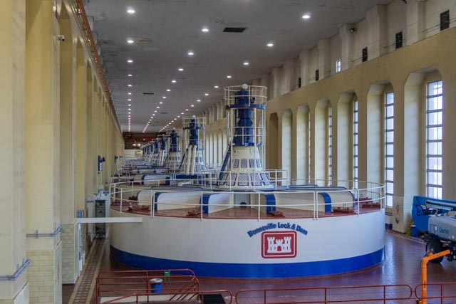 This is original powerhouse. It is originally fitted with 1 – 4,000 KW (thousand watt) generator and has been upgraded with two additional 54,000 KW and 8-60,000 KW generators. We went into one of the the power houses and viewed the exhibits that were on display. The second powerhouse holds 2 generators at 13,500 KW each plus 8 generators at 76,000 KW each. Total generation of the facility is 1,227,000 MW (million watts). By comparison, The Dalles (also on the Columbia) produces 2.1 million W, the John Day (also on the Columbia) produces 2.2 Million KW and the Grand Coulee, further up the Columbia has the potential of over 10 million KW. Currently the Columbia produces 20,732 MW.