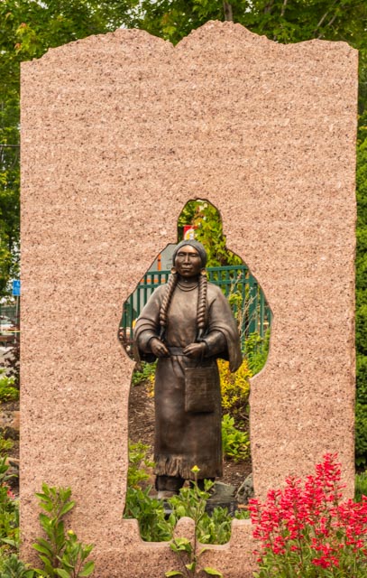 This statue was kind of unique. The bronze lady is several feet behind the opening in the wall It is called “The Return” by the artist.