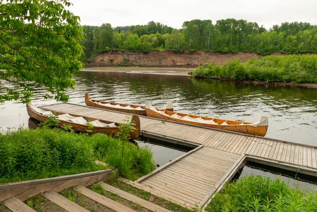 Canoes dockside, made from birch bark, stand ready for adventurous paddlers. These are rentals for later in the season. It is best to keep the bark moist to prevent drying out and splitting seams.