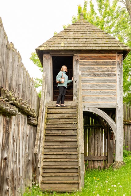 Cathy is on top of what appears to be a guard tower at the front corner of the fort. Notice the spiked dowels that were used in the construction of the perimeter fencing. They face inward and outward; dual purpose maybe?