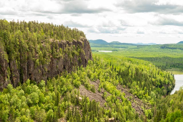 We took the “Off the Beaten Path” route to Quebec. We made it down to Ouimet Canyon Provincial Park, near Dorion in Ontario. This canyon is 3K (1.9 miles) long, 152M (500 feet) across and 107M (361 feet) deep. Flora on the floor of this canyon are typically found about 1,000KM (621 miles) to the north of this location. We drove with the motorhome as far as we could on a very narrow road and were forced to leave it in a small parking area so we could take the truck the final mile or so. There was no way to turn around at the bottom as it was our only choice. We got a lot of odd looks while going in.
