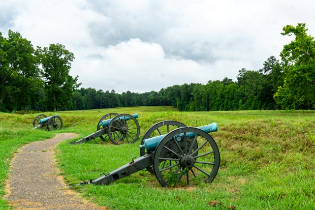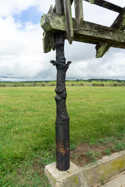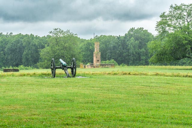 We drove the tour of the Eastern Front of the Petersburg battle. This is Confederate Battery 9 and contains examples of siege fortifications and related structures. A smooth bore cannon on the left and a mortar is on the right, behind breastworks and earthen fortifications.