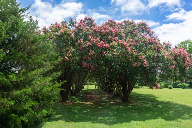Looking down these rows of crepe myrtles, you can see the cast iron archway leading to another home which is no longer there.