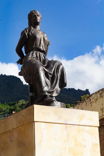 This is the monument to Policarpa Salavarrieta, 1795-1817. She was also referred to as “La Pola.” She was a seamstress who spied for the Revolutionary Forces during the Spanish Reconquista. She was captured by Spanish Royalists and executed for high treason. The Day of the Colombian Woman is commemorated on the anniversary of her death. Considered a heroine in Colombia, she was featured on one on the currency notes. La Pola was the first woman to be featured on a Colombian banknote, debuting on the two-peso gold banknote in 1963. In 1995 she reappeared on the 10,000 peso note.