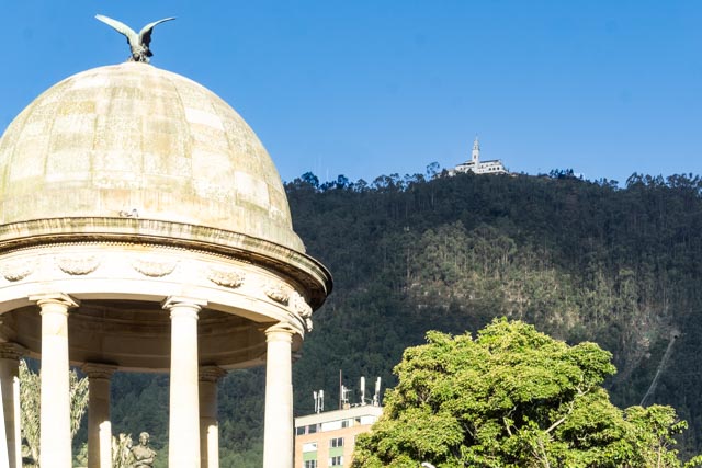 A last look at Mt. Monserrate and the sanctuary. The funicular to the top can be seen on the bottom right of this photo. The mountain rises about 2,000 feet above Bogota.