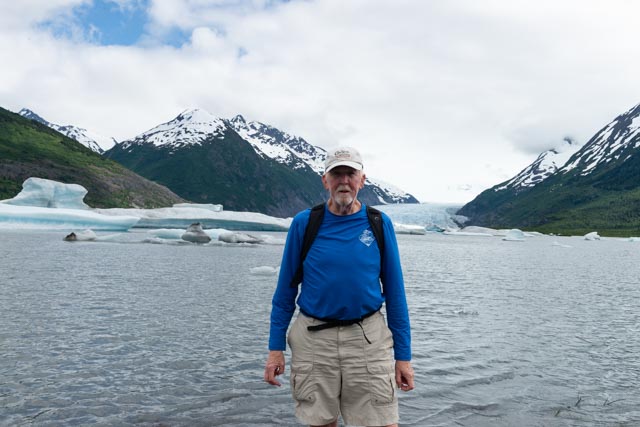 This is our view of the glacier at the shoreline. It would be an additional 1-3/4 mile hike to the face of the glacier, but we opted out. There were massive, blue tinted icebergs floating about. The glacier terminated at the Placer River (foreground).