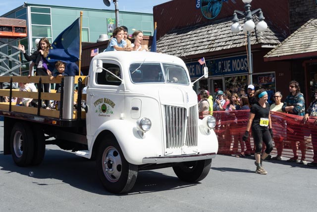 Racers were still finishing during the parade, two hours later. You can see a lady running down the left side of the street. There were runners on both sides of the parade.