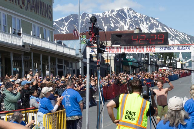 This is Mount Marathon. You go up on the left circle the flag on top and come don on the right. Sounds easy? Runners chose their own paths to the top, there is no set course. You have to see it to believe it.