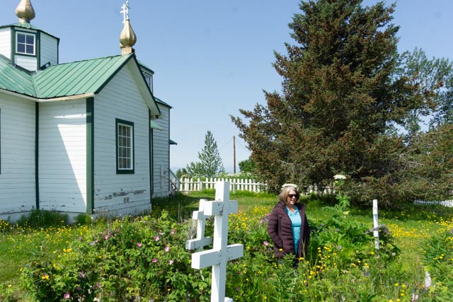 We attended service at the church on Sunday. The original church was founded in 1846 by Father Nicholai, a Russian monk. The present building was built in 1894 on a $400 grant from the Russian Synod. With its three onion-shaped domes, it is considered one of the finest examples of a Russian Orthodox church built on a vessel or quadrilateral floor plan. Icons from Russia and a 1847 Russian edition of the Holy Gospel, with enameled icons of Matthew, Mark, Luke and John on the cover are displayed here. It one of the oldest standing Orthodox churches in Alaska. Regular church services are still held here.