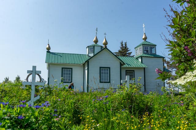 On Tuesday, we drove south to see a few other churches. These are some views of the Holy Transfiguration of Our Lord Russian Orthodox Church, located in the village of Ninilchik. The Russian cemetery surrounds the church and is totally covered with wildflowers.