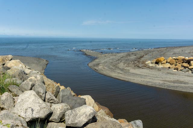 This is where boats domiciled at Ninilchik harbor enter the sea, at high tide! You can see the high tide markings on the gravel below the rocks. At high tide, the water reaches to bottom layer of rocks.