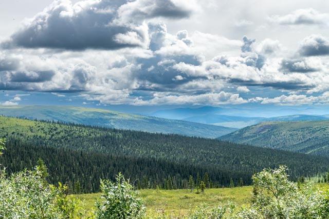We decided to visit the town site of Central on the Steese Highway. I stopped to pick some blueberries that were plump and begging to be picked! Little did we realize how long this day trip was going to be, with all the stopping I would be doing. Central is about 150 miles from our base in Fairbanks, with more than half on dirt roads. They were repairing the roads once we got on the gravel and dirt portions and used plenty of water to keep the dust down. But the mud level was high and it was slow going. I was glad we put off washing it until after our Prudhoe journey next week. When we left Fairbanks there was not a cloud in the sky. As we traveled north, the clouds started to build and we even had some spotty downpours on the return.