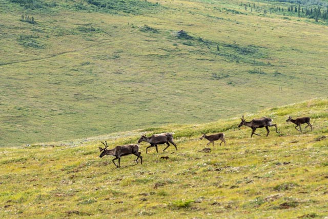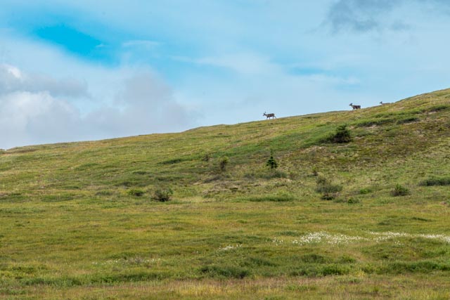 Alaska Fish and Game Officers stopped on the road and pointed out the Caribou on a distant ridge-line. We watched a ATV approach these and they ran down the other side. We expected the drivers to get in trouble but they were actually on an ATV trail.