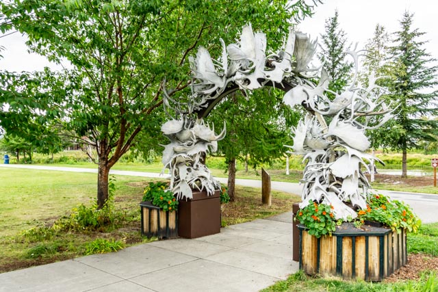 Located behind the Cultural and Visitors Center in downtown Fairbanks, the Antler Arch has become a popular local landmark. It is composed of 100 pair of antlers collected from all over the state. It is at the gateway of the Downtown Riverwalk.