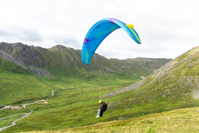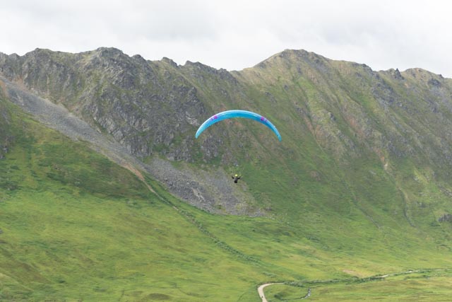 We took a ride up Fishhook road to see the Independence Mine, which was totally fogged in during our previous trip with Brent and Tina. We stopped at Summit Lake and watched several para-gliders flying about.