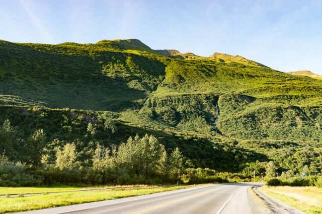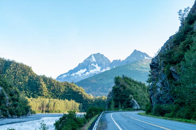 This is the view looking down the highway adjacent to our motorhome park. There is the Crooked Creek Information Site, the Crooked Creek Falls, and the Chugach National Forest salmon spawning viewing stream and platform at the bend in the road.