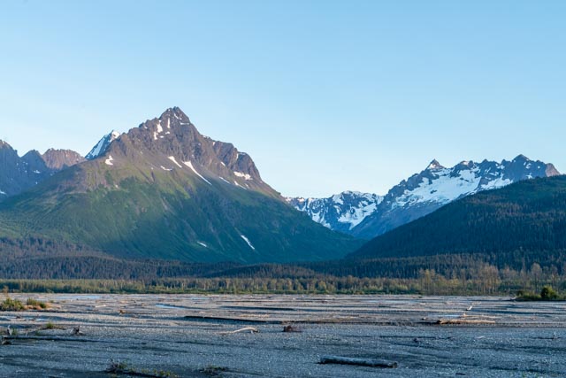 Looking at snow-capped Chugach Range mountains across the braided Lowe riverbed.